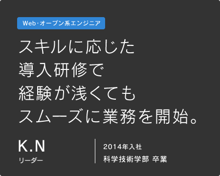 | 2013年 | 大学院修了後、ITコンサルティング会社に就職し、SEとしてWeb系システムの開発を経験。 |